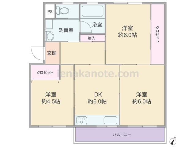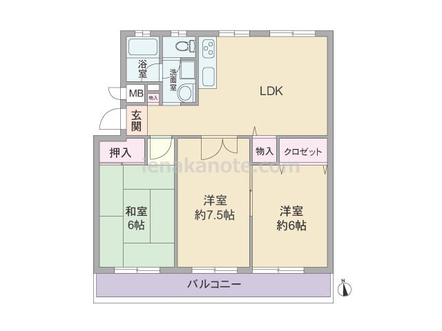 専有面積65.64平米の3LDK。センターイン、ワイドスパンのプラン。洋室約6.0帖は洋室約7.5帖を通って行き来します。洋室約7.5帖には収納スペースが無いため、場合によっては家具の設置が必要です。洗面室はトイレへの動線上にあり、トイレ...