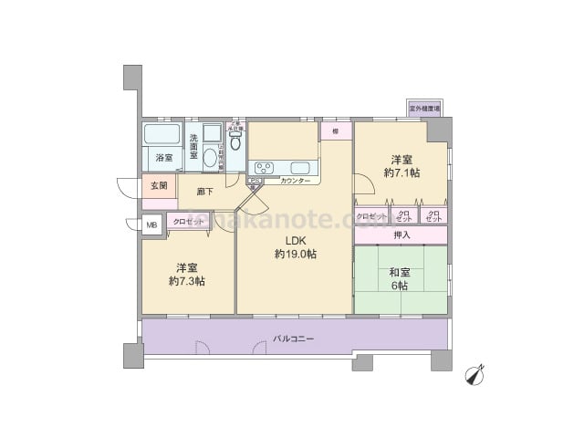 専有面積85.19平米の3LDK。全室に窓がある、ワイドスパンのプラン。LDKは約19.0帖大とゆとりがあり、対面カウンタータイプのキッチンはリビング全体を見渡す事ができます。和室の襖を開放すれば、LDK約25.0帖大としても使用可能。各...