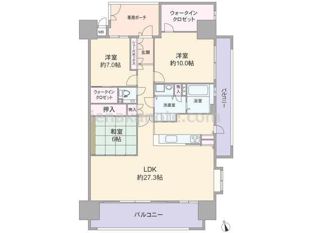 玄関・居室前に専用ポーチが付いた、独立性の高いプラン。どの部屋も6帖以上のゆとりが確保されています。二面採光のLDKは約27.3帖大と大変広く、和室6帖の引き戸を開放すれば約33.3帖大の空間に。和室の板間は家具を置くのに便利です。対面・...