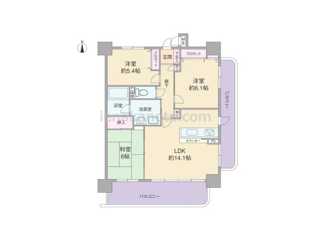 専有面積70.20平米の3LDK。LDKは14.1帖、キッチンはカウンタータイプ。リビングと和室が続き間になっており、襖を開ければ約20帖大の広々とした空間になります。全室に収納スペース付きです。