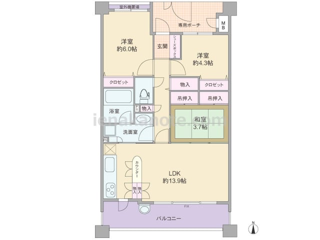 専有面積65.84平米の3LDK。玄関前に広々としたポーチがあり、プライバシーに配慮されています。LDKは13.9帖、使い勝手の良いカウンターやバルコニーへ出られる勝手口が付いており、洗面室へも行き来がしやすく家事動線に優れています。和室...