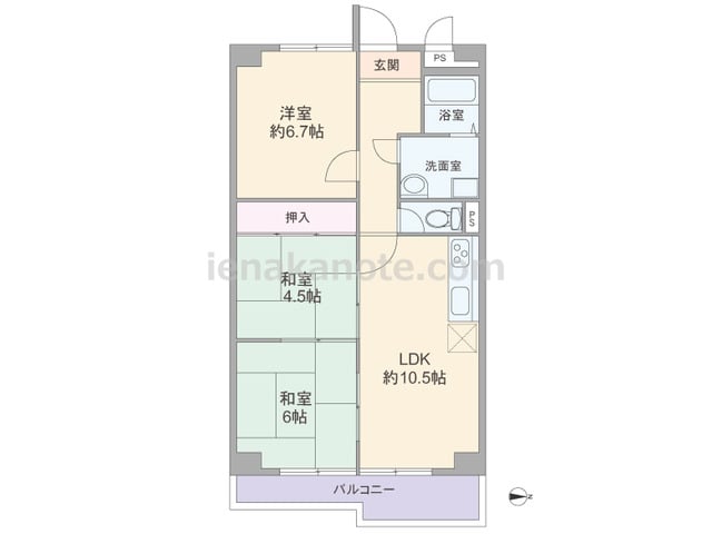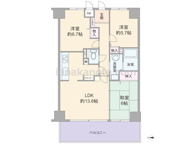 専有面積67.86平米の3LDK。キッチンはリビング・ダイニングが広く使える壁付けタイプ。和室2室が、LDKに隣接しているため襖を開放すれば、家族団らんのスペースとしても活躍しそうです。和室6帖には収納はありませんが、廊下に物入付きです。