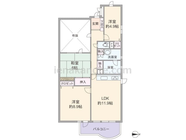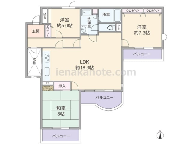 専有面積90.09平米の3LDK。玄関先から室内を見通せない、プライバシーを保ちやすい造り。LDK約18.3帖は扉が2カ所あり、キッチンは吹抜に面して窓があります。LDKを含む3部屋にバルコニーがあり、和室8帖は床間、主寝室約7.3帖は壁...