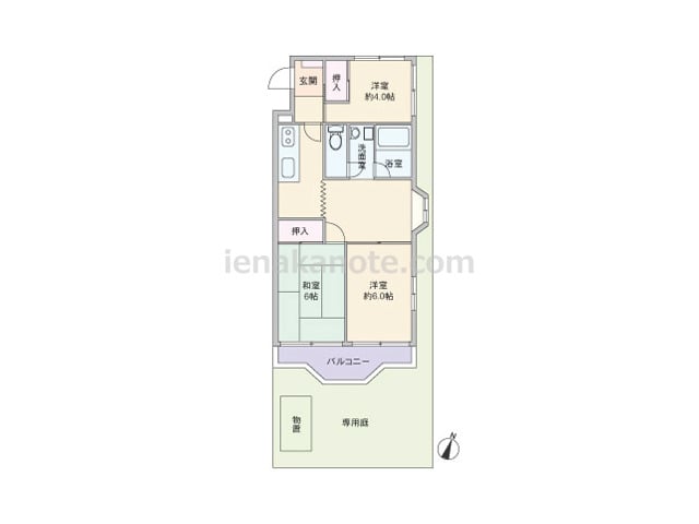 専有面積51.75平米の3DK。専用庭付き、戸建気分を味わえるプラン。室内廊下が短く、居住空間が優先されているのも特徴です。キッチンを通ってリビング・ダイニングや和室・洋室約6.0帖を通って行き来する造り。洋室約6.0帖は引き戸を開放して...