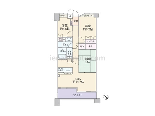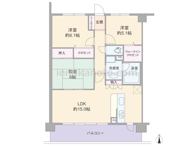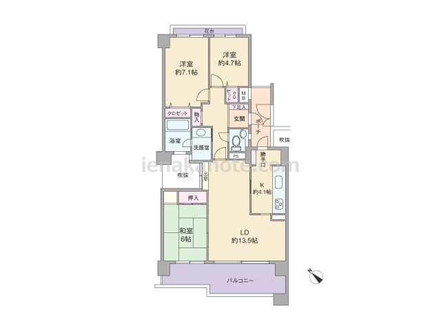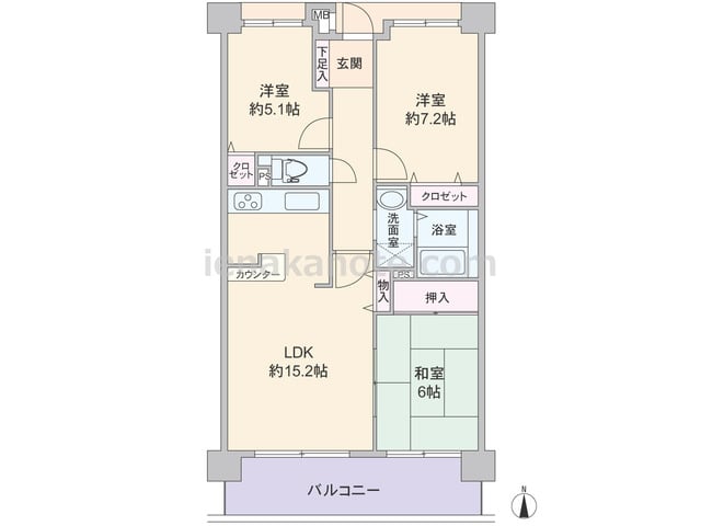 専有面積72.20平米の3LDK。横長リビングのプラン。キッチンはリビング全体を見渡せる対面式で、キッチン横にはバルコニーへの勝手口があります。和室6帖へはLDKと室内廊下の2カ所から出入りが可能。全部屋に収納が設けられています。バルコニ...
