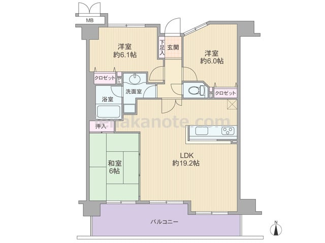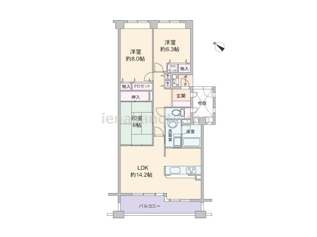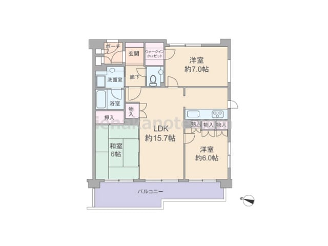 専有面積76.6平米の3LDK。玄関前にプライバシーに配慮されたポーチ付き。ワイドスパンのプランで、LDKを含む3部屋がバルコニーに面しています。全室6帖以上の広さで、各部屋に収納スペース付き。約7帖の主寝室にはウォークインクロゼットがあ...