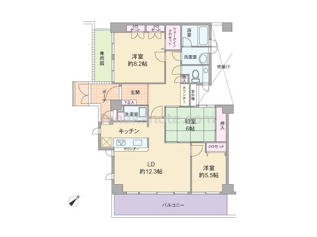 専有面積88.59平米の3LDK。玄関前にはポーチがあり、共用廊下に直接面する居室の無いプライバシー重視のプラン。キッチンはカウンタータイプ、背面にはポーチへ出られる勝手口と洗濯室のある、家事効率の良い間取り。8.2帖の主寝室北西側には専...
