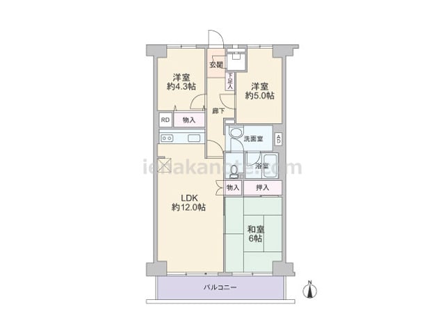 専有面積76.59平米の3LDK。ワイドスパンのプランで、南側に窓が3カ所に付き。室内廊下が短く、専有面積を有効に利用しています。キッチンはカウンタータイプ。全居室に収納スペース付き。バルコニーは13.53平米の広さがあり、ガーデニングを...