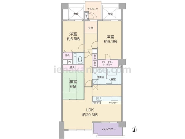 専有面積70.02平米の3LDK。キッチンはカウンタータイプ。LDKの窓はコーナーサッシで、開放感があります。各部屋に収納スペース付き。LDKと和室6帖が続き間で、約20.7帖の一つの空間としても使用出来ます。