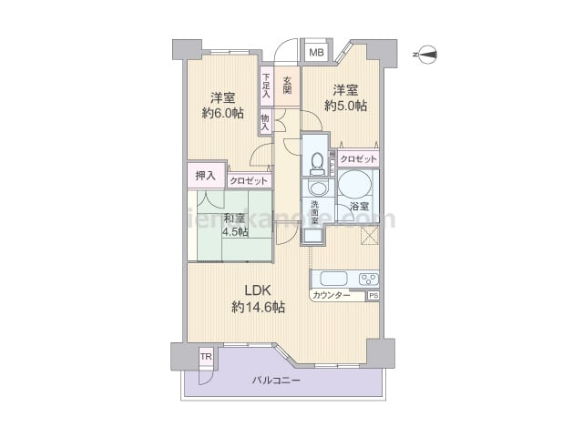 専有面積65.64平米の3LDK。LDKは14.6帖、キッチンはカウンタータイプ。LDKに隣接して4.5帖の和室があり、一つの空間としても使用可能。各室に収納があり、バルコニーにはトランクルームがあるなど収納スペースが充実しています。