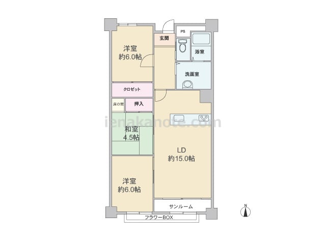 専有面積76.50平米の3LDK。玄関前にはポーチ付き。南・東・北の3面をぐるりとバルコニーが囲んでおり、開放感があります。キッチンはカウンタータイプ。家事をしながら家族の様子を伺えます。和室4.5帖がリビングに面しているため、襖を開放す...