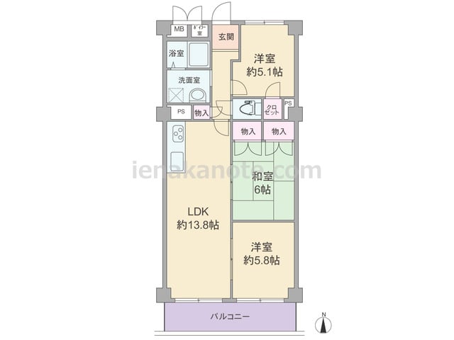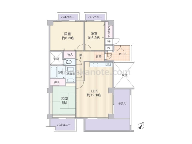 専有面積83.52平米の3LDK。センターイン、ワイドスパンのプランで、3室が南向き。南北両面にバルコニーがあります。全部屋6帖以上の広さがあり、和室はゆとりの8帖。キッチン、浴室、トイレにも窓があり、換気がよく快適です。