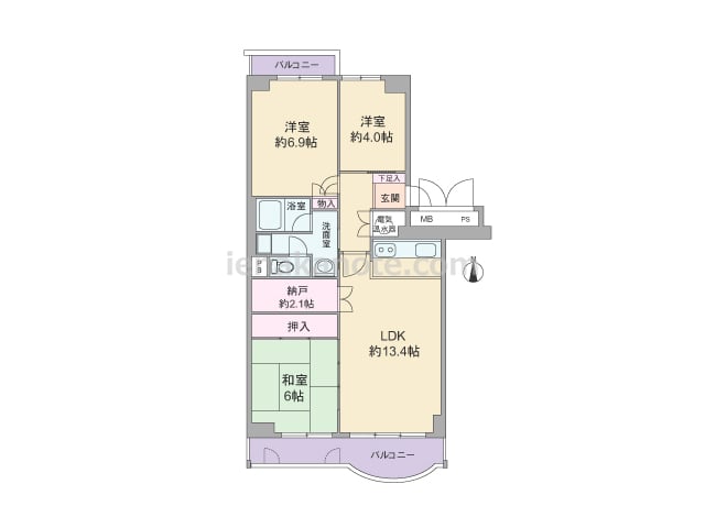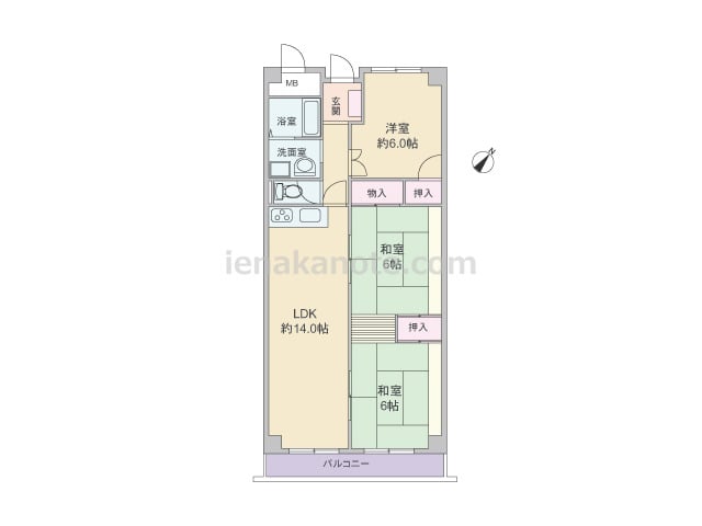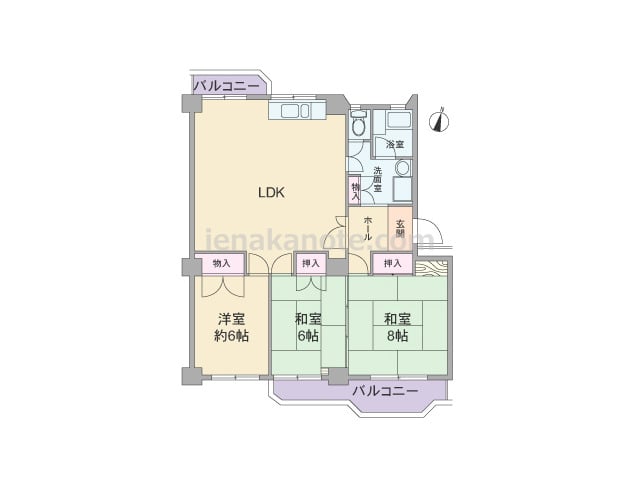 専有面積79.74平米の3LDK。玄関前にはポーチ付き。直接共用廊下に面した窓がなく、独立感のある部屋。キッチンは壁付けタイプ。リビング・ダイニングを広く使える配置です。和室6帖がLDKに隣接しているため、襖を開放すれば、約18.1帖のス...