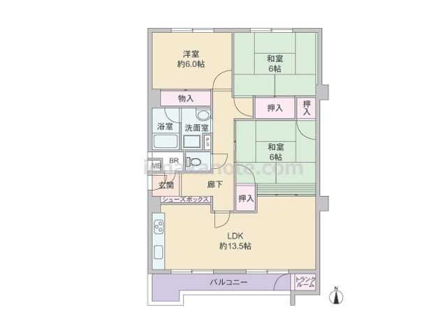 専有面積75.50平米の3LDK。廊下の短い、専有面積を有効に利用したプラン。全部屋6帖以上の広さがあります。またLDKと2部屋の和室が続き間で、生活シーンに合わせてフレキシブルに使用出来ます。