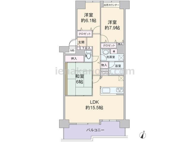 専有面積77.86平米の3SLDK。玄関前には専用ポーチ、南北両面バルコニー付きで、直接共用廊下に面した窓がない独立感のある部屋。キッチンはカウンタータイプで、家事をしながら家族の様子を窺うことができます。和室6帖がリビングに隣接しており...