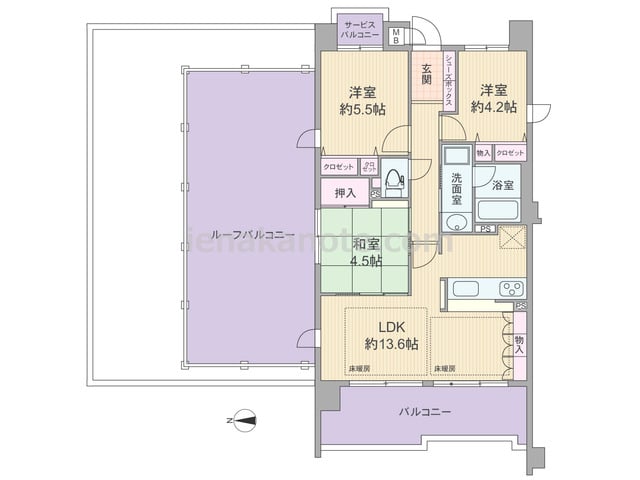専有面積64.26平米の3LDK。ルーフバルコニー付きプラン。LDKは約13.6帖、キッチンは家事中も家族とコミュニケーションがとりやすい対面カウンター仕様。和室4.5帖は室内廊下とLDKの2カ所から出入りでき、個室や客間、くつろぎのリビ...