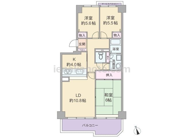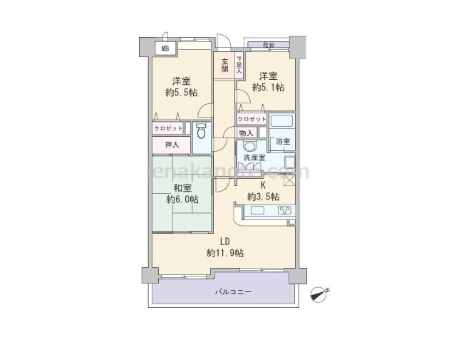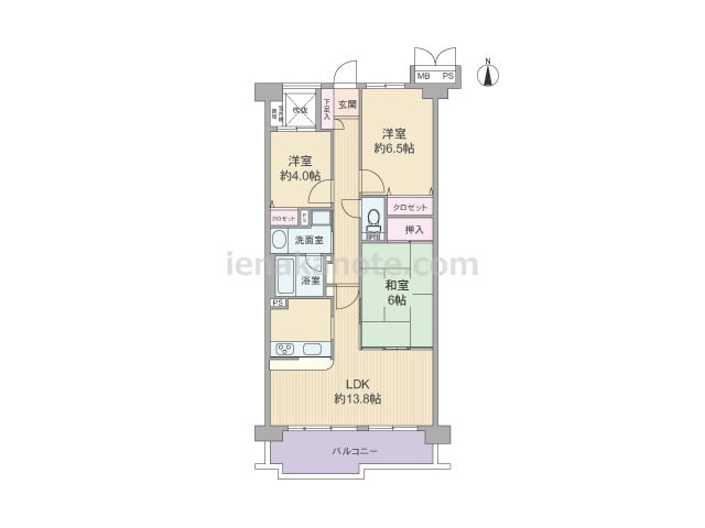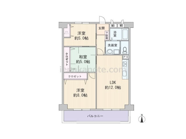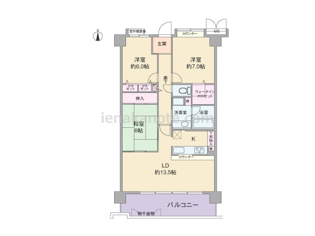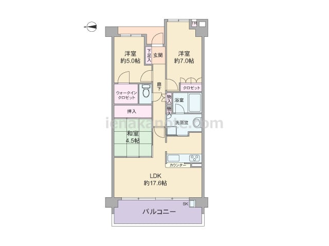 専有面積75.80平米の3LDK。センターインのプラン。キッチンはカウンタータイプで、すぐ横に洗面室などの水回りがあり、家事動線にすぐれています。LDKと和室が続き間で、襖をあければ、合計約20.8帖の一つのスペースとしても使用可能。バル...