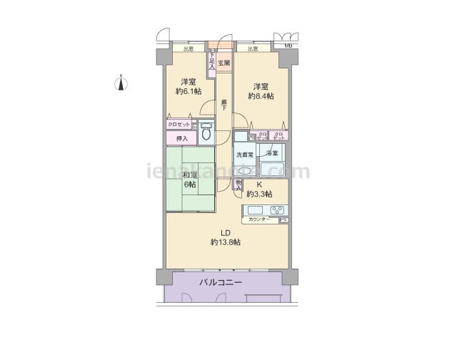専有面積73.00平米の3LDK。廊下面積の少ない、居室空間を優先したプラン。キッチンは壁付けのオープンタイプ。主寝室は約8帖大。各部屋に収納スペースがあります。