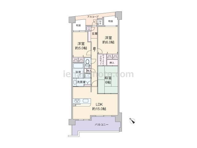 専有面積74.71平米の3LDK。玄関前にアルコーブ、また、共用廊下と住戸との間に吹抜けがある、プライバシー重視のプラン。LDKは15帖、キッチンはカウンタータイプで、家事効率の良い2WAY動線です。リビングと和室は続き間になっており、襖...