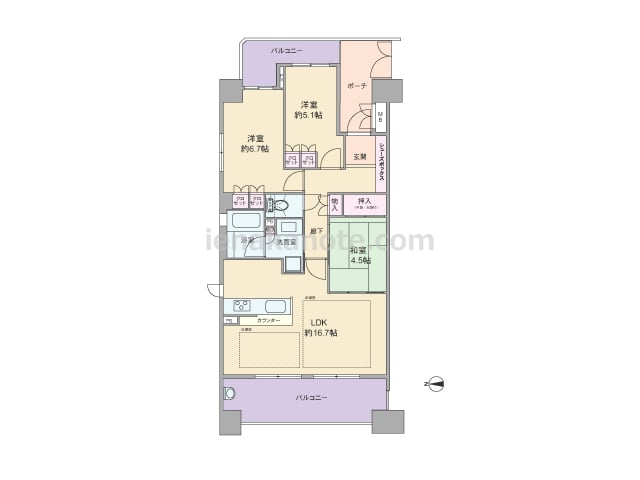 専有面積74.20平米の3LDK。玄関前にポーチがあり、室内廊下がクランク状になったプライバシーに配慮されたプラン。LDKは約16.7帖大、キッチンはカウンタータイプ。キッチン・浴室にも窓があり、換気がしやすく快適。東西両面にバルコニー付...
