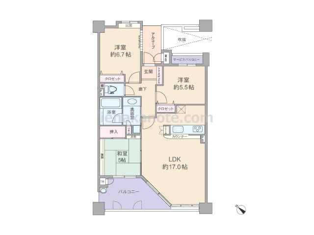 専有面積73.60平米の3LDK。玄関前には広々としたアルコーブがあり、洋室5.5帖の北側はサービスバルコニーと吹抜けで、プライバシーに配慮されています。LDKは17帖、キッチンはカウンタータイプ。リビングと和室は続き間になっており、襖を...