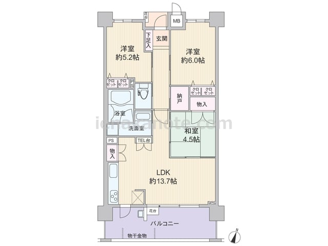 専有面積66.38平米の3LDK。キュービックプランでバルコニーに3室が面しています。キッチンはL字型の対面タイプ。洗面室にも物入があり、日用品やタオルを入れるのに便利です。