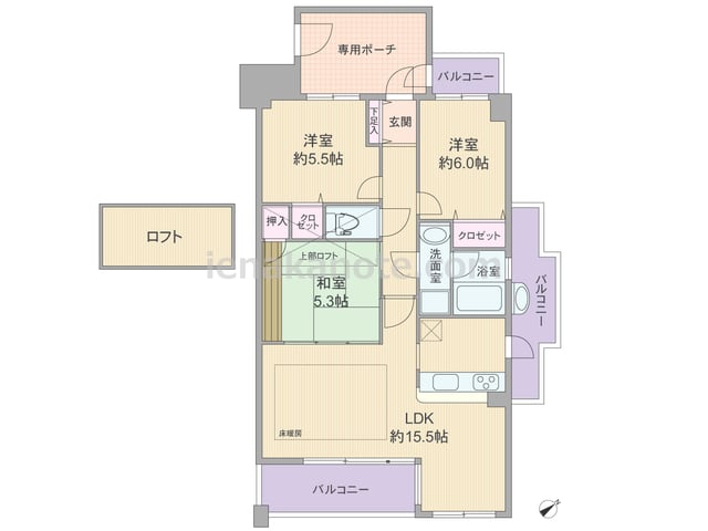 専有面積64.89平米の3LDK。住居が専用ポーチとバルコニーに囲まれているプライバシー重視の造りで、ロフトがあるのも特徴です。キッチン前は二方向に窓がある開放的な空間で、ダイニングの利用にぴったり。キッチン横にバルコニーへの勝手口があり...