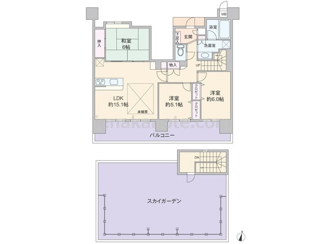 専有面積85.10平米の3LDK。スカイガーデンが付いたプラン。和室以外は南側バルコニーに面しており、キッチンはリビング全体を見渡せる対面仕様。和室は個室に利用したり、引き戸を開放してくつろぎのリビングスペースにするなど色々な用途に使えそ...