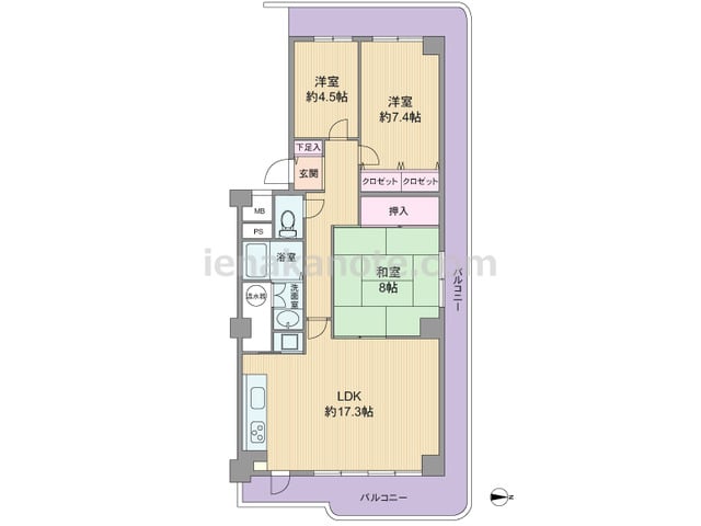 専有面積81.71平米の3LDK。全室バルコニーに面した明るく・開放的なプラン。LDKは約17.3帖あり、キッチン横に洗濯機置場とバルコニーへの勝手口が付いた家事動線のよい造り。和室8帖は室内廊下とLDKの2カ所から出入りでき、個室や客間...