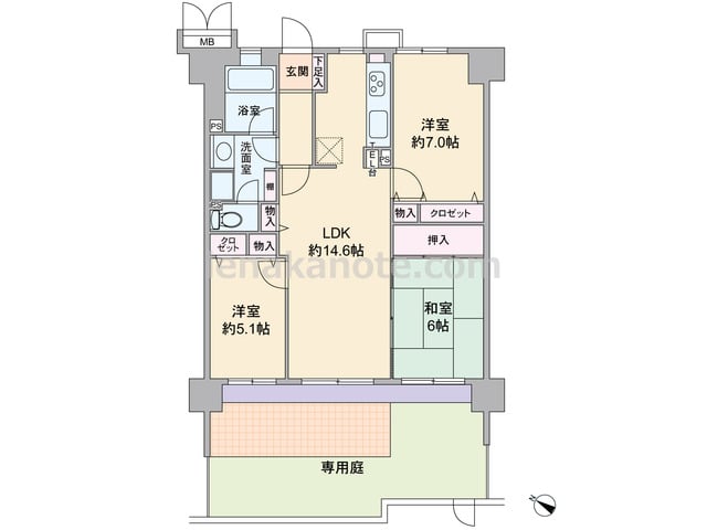 専有面積72.54平米の3LDK。専用庭付きプラン。どの部屋もLDKを通ってアクセスするため、家族のコミュニケーションの機会が増えます。生活感の出やすいキッチンは奥まって配置され、キッチンと浴室の窓は換気がしやすく快適です。各居室とLDK...