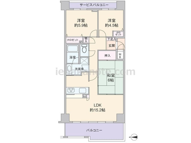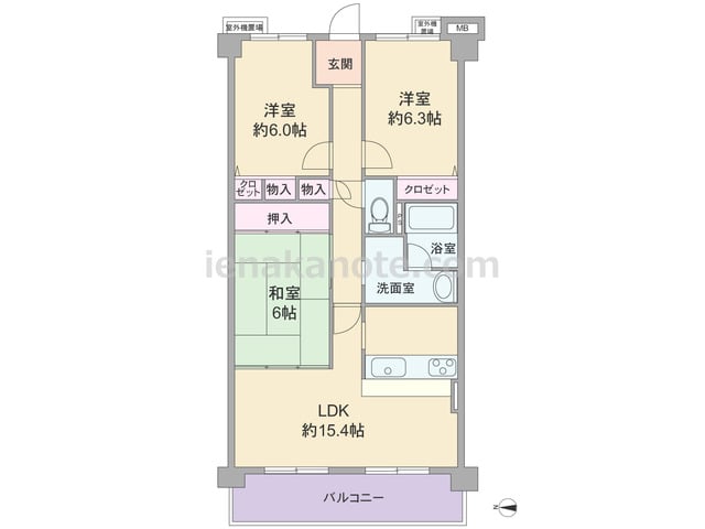 専有面積75.6平米の3LDK。どの部屋も6帖以上のゆとりが確保されたプラン。LDK約15.4帖には和室6帖が隣接しており、和室は玄関ホールからも出入りできます。対面式カウンターキッチンは料理をしながら家族と会話を楽しめます。各居室と玄関...