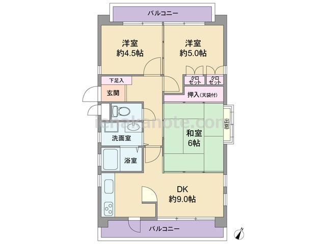 専有面積52.76平米の3DK。南北両面にバルコニーがある、センターインのプラン。キッチンはI型の壁付け・オープンタイプで、キッチン背面にミニカウンター付き。キッチン横にはバルコニーへの勝手口があります。和室6帖は室内廊下とDK約9.0帖...