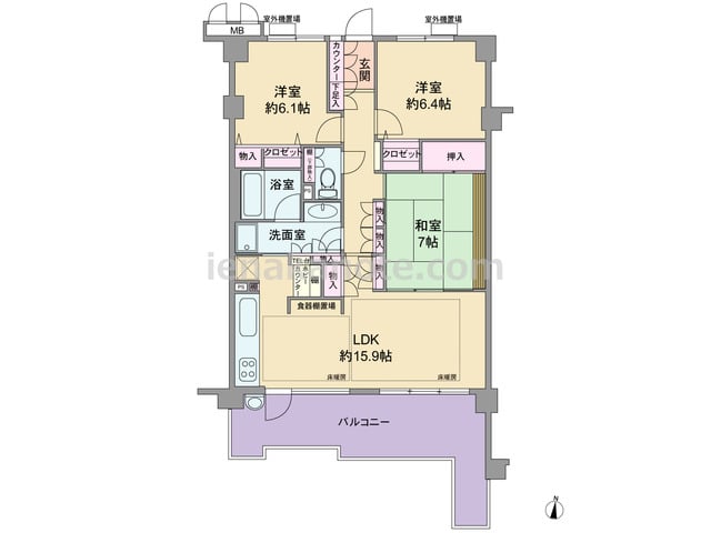 専有面積81.9平米の3LDK。どの部屋も6帖以上の広さが確保された、横長リビングのプラン。LDKは約15.9帖、キッチンは開放的なウォールタイプ。キッチンから洗面室・バルコニーへアクセス可能な家事効率の良い造りです。和室7帖はLDKと室...