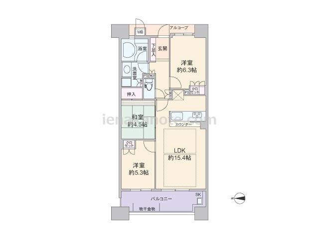 専有面積68.56平米の3LDK。共用廊下との間にアルコーブがある、プライバシーに配慮されたプラン。LDKは約15.4帖、キッチンは料理をしながら家族と会話を楽しめる対面カウンタータイプ。和室4.5帖と洋室約5.3帖はLDKを通って出入り...