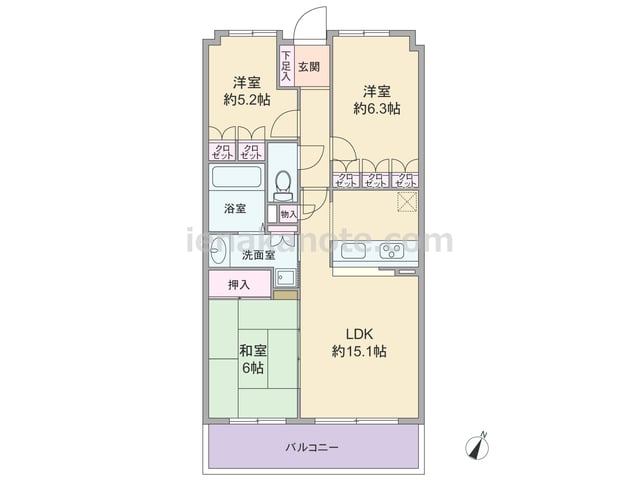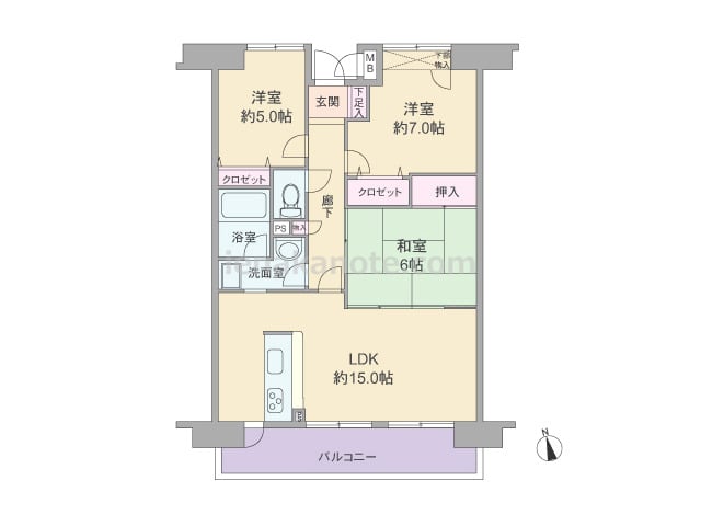専有面積70.56平米の3LDK。LDKは約15.0帖、キッチンはリビング・ダイニングを見渡せる対面カウンタータイプ。キッチンは洗面室・バルコニーへ行き来でき、家事動線の良い造りです。和室6帖は室内廊下とLDKの2カ所から出入りでき、LD...