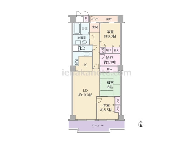 専有面積93.63平米の3SLDK。共用廊下と玄関・居室の間にはアルコーブ・前庭があり、共用廊下に面して物入付き。キッチンはL字型。和室6帖はリビング・ダイニング約19.0帖と洋室約5.5帖と続き間になっており、襖を開放すれば部屋を広く使...