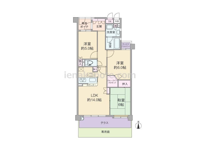 専有面積70平米の3LDK。専用庭、専用ポーチが付いた戸建感覚のプラン。玄関にはコーナーサッシを用いるなど、採光にも配慮されています。LDKは約14.0帖、キッチンは対面カウンタータイプ。各居室とLDKに収納スペースが設けられています。洗...