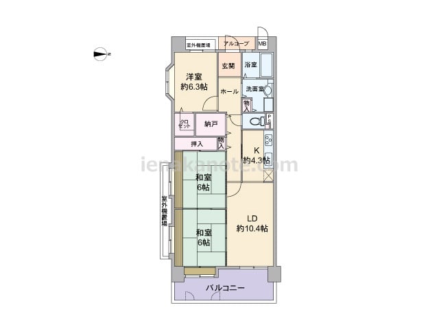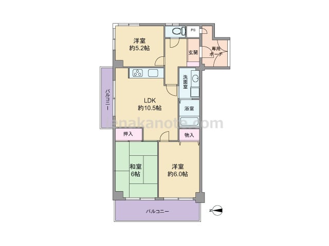 専有面積59.85平米の3LDK。玄関前にはプライバシーに配慮された専用ポーチがあります。センターリビングのプランでLDKは約10.5帖、キッチンは開放的なウォールタイプの仕様。LDKに隣接する洋室約6.0帖、和室6帖は収納スペース付き。...