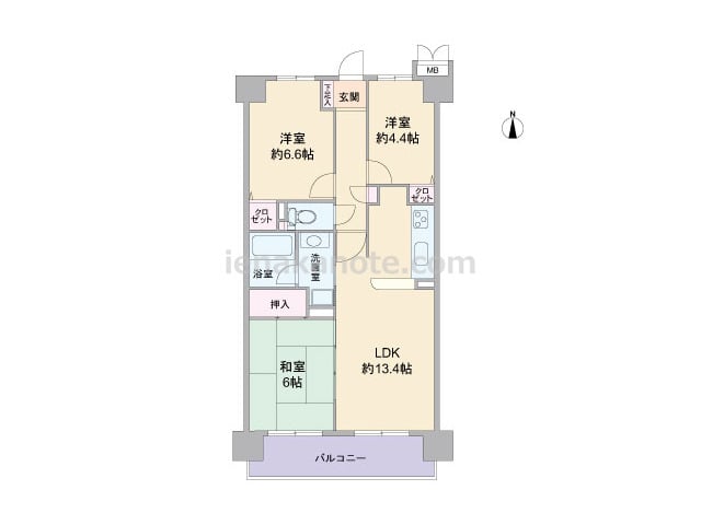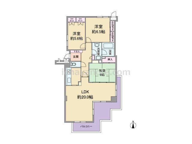 専有面積64.56平米の3LDK。キッチンはI型、壁付けタイプで、便利なカウンター付き。すぐ横に洗面室の入り口があり、家事動線にすぐれています。LDKと和室が続き間で、約19.4帖の一つの空間としても使用可能。主寝室は約6.6帖大。各部屋...