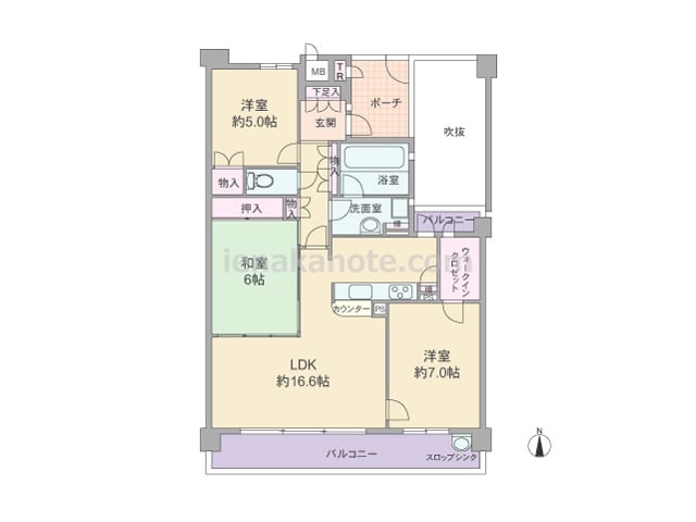 専有面積77.84平米の3LDK。玄関前に専用ポーチとトランクルームがあり、玄関に明り取りの窓があるのもポイントです。LDKは約16.6帖大とゆとりがあり、和室6帖の襖を開放すれば約22.6帖大の空間としても利用可能。カウンタータイプのキ...