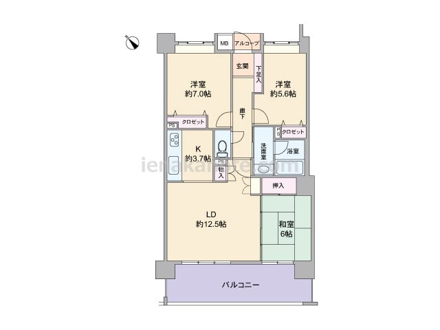 専有面積85.7平米の3SLDK。居室の窓が共用廊下に面しておらず、玄関前にアルコーブが付いたプライバシー重視のプラン。二面採光のLDKは約22.0帖大と広く、コーナーサッシも用いられており明るく開放感があります。和室の襖と納戸約1.7帖...