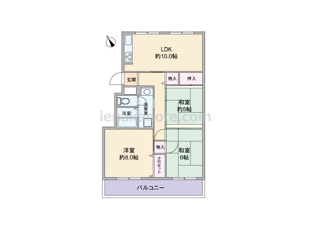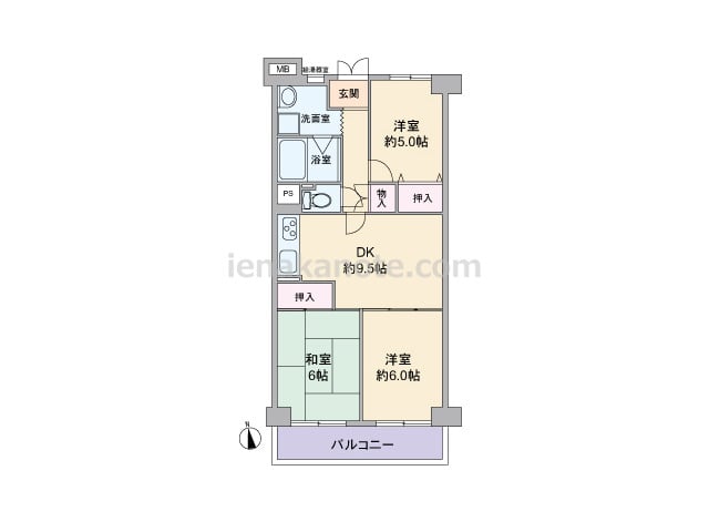 専有面積61.6平米の3DK。センターリビングのプラン。DK約9.5帖に隣接する洋室約6.0帖には収納スペースがありませんが、扉を開放すればLDK約15.5帖大として使用出来ます。キッチンはI型の壁付け・オープンタイプ。洋室約5.0帖とD...