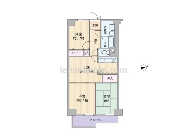 専有面積66.00平米の3LDK。センターリビングのプランで、独立型のキッチンは生活感がリビングスペースに伝わりにくいのが特徴。LDKに隣接する洋室約7.1帖にはクロゼットがありませんが、扉を開放すればLDK約17.3帖大に。洋室約5.7...