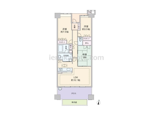 専有面積77.8平米の3LDK。玄関前にアルコーブとトランクルームがあるプラン。LDKは約16.1帖、カウンタータイプのキッチンは洗面室へもアクセス可能な家事効率の良い造り。和室6帖は室内廊下とLDKの2カ所から出入りでき、LDK側の襖を...