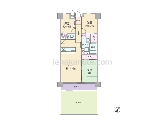 専有面積77.84平米の3LDK。専用庭が付いたプラン。LDKは約16.7帖大のゆとりがあり、和室の襖を開放すれば約22.7帖大の空間としても利用可能。対面カウンタータイプのキッチンは、作業をしながらリビング全体を見渡せます。収納スペース...