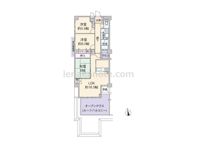 専有面積76.65平米の3LDK。居室の窓が共用廊下に面していない、プライバシーを確保したプラン。LDK約16.5帖に隣接する和室の扉を開放すれば、約22.5帖大の空間としても利用できます。キッチンは対面カウンタータイプ。収納スペースが各...