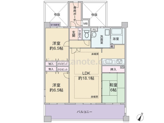 専有面積81平米の3LDK。玄関前に専用ポーチがある、ワイドスパンのプラン。LDKに隣接する和室の襖を開放すれば、約24.1帖大の空間に。生活感の出やすいキッチンは奥まって配置されているため、リビングスペースはくつろぎの空間を演出できます...