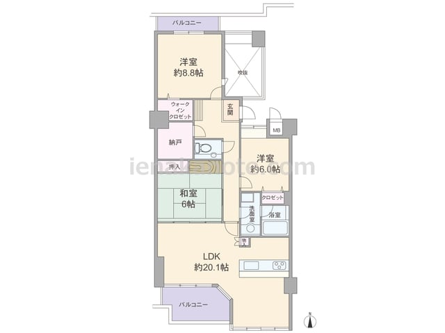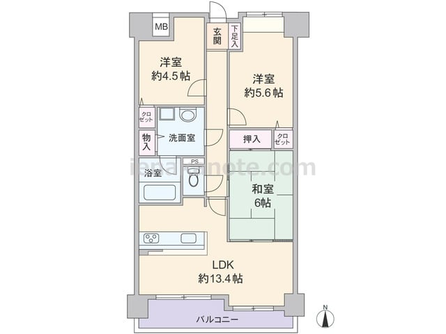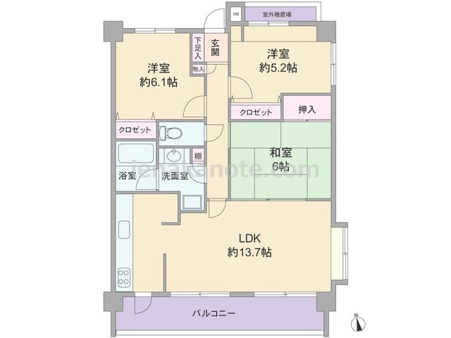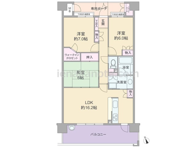 専有面積70.16平米の3LDK。横長リビングのプランで、南北両面にバルコニー付き。LDKは明るい2面採光。キッチンはバルコニーに面して配置され、便利な勝手口付き。各部屋の他、廊下、洗面室にも収納スペースがあります。