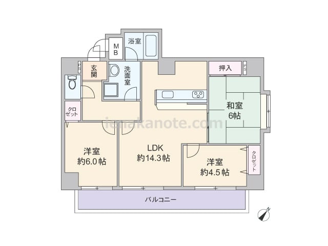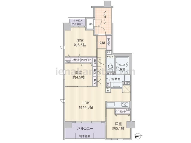 専有面積71.45平米の3LDK。玄関前には広々としたアルコーブがあり、共用廊下に直接面する居室の無いプライバシー重視のプラン。LDKは14.3帖、キッチンは独立タイプ。LDKと洋室4.5帖は続き間で、引き戸を開放すれば洋室はリビングの一...