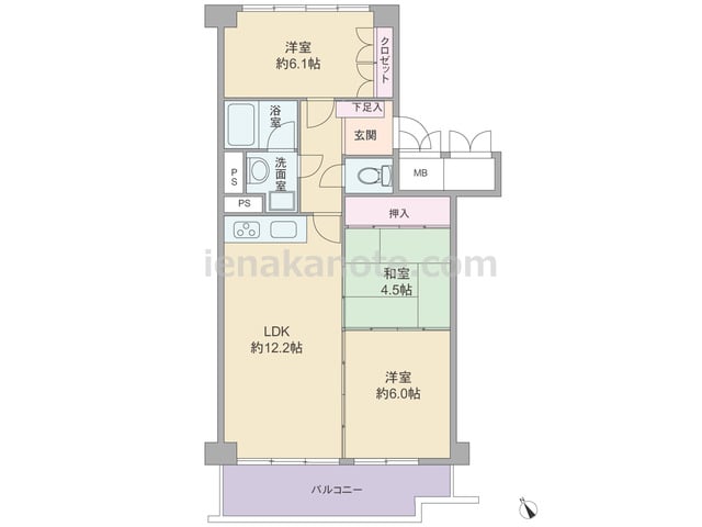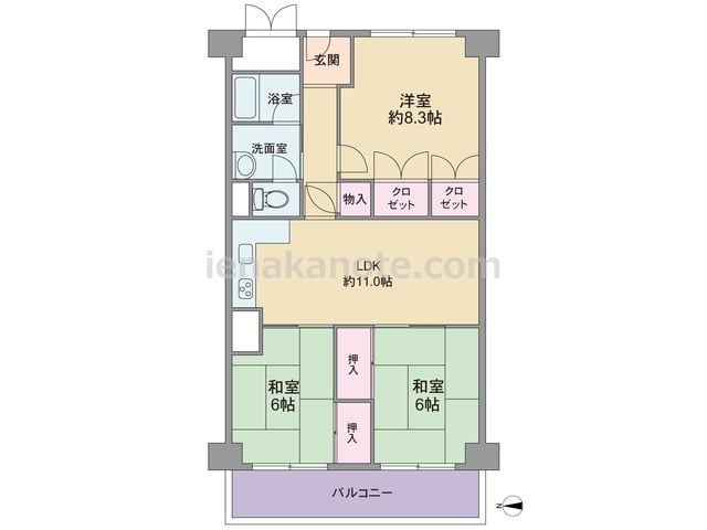 専有面積71.50平米の3LDK。全部屋6帖以上の広さがあるセンターリビングのプラン。主寝室はゆとりの約8.3帖大。キッチンは壁付けのオープンタイプ。各部屋に収納スペースがあります。
